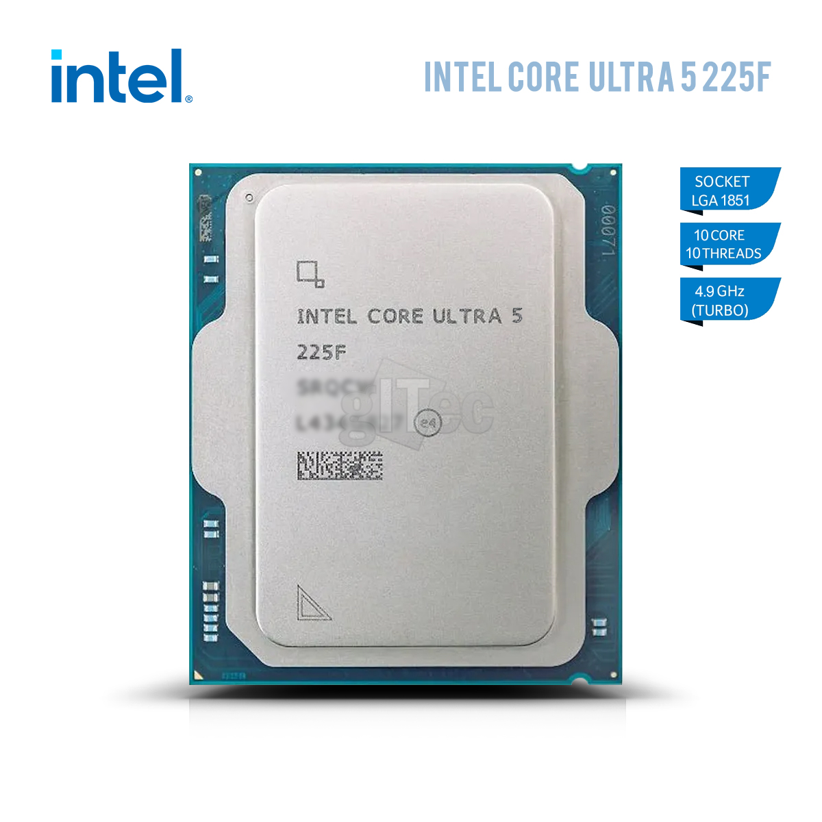 Intel Core Ultra 5 225F (3.3 GHz / 4.9 GHz) 10-Core Processor (6 Performance-Cores + 4 Efficient-Cores) 10-Threads Socket 1851 Smart Cache 20 MB + L2 22 MB 0.003 micron (Tray version with out box) 1 - year warranty.